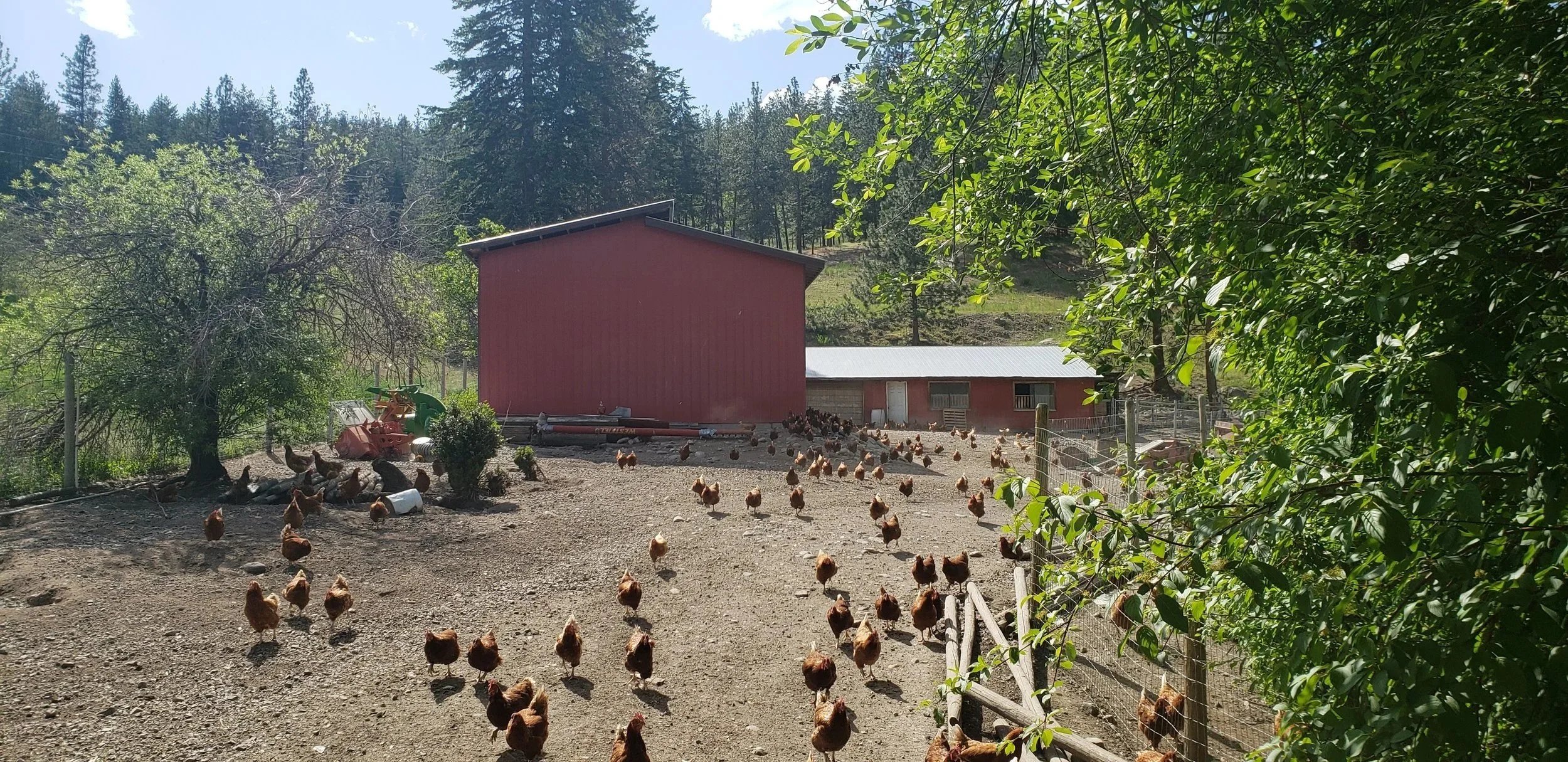 Our chickens spend their nights cozy in two medium‑sized barns on our nine‑acre farm, and their days happily roaming the property. They enjoy grain along with fresh veggie scraps from local school food programs and food banks—a wholesome mix they look forward to. They’re raised with care, plenty of space, and the kind of daily attention that keeps them healthy and content.